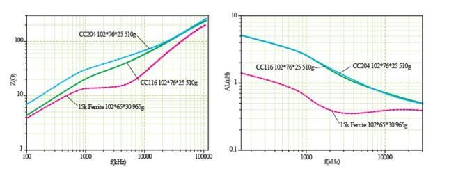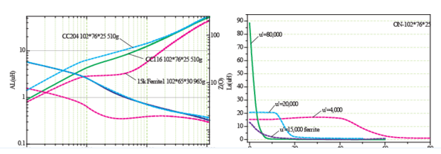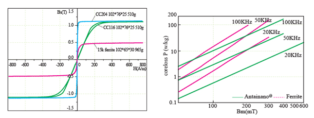 | Comparación de inductancia e impedancia de una sola vuelta de núcleo nanocristalino y de ferrita | Comparación del bucle de histéresis estática y la pérdida del núcleo entre núcleos nanocristalinos y de ferrita |