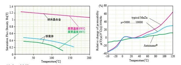 | Componente de CC de polarización de comparación de rendimiento del núcleo de ferrita nanocristalina | Comparación del rango de temperatura y la estabilidad de la temperatura del núcleo nanocristalino y de ferrita |